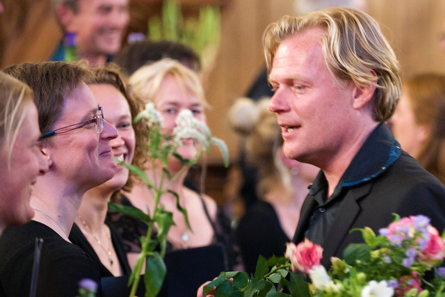 In Paradisum verdelen we de bloemen alsof we het hebben ingestudeerd. Raoul kijkt de bedrijvigheid met lichtelijke verwarring aan. Is het een keertje omgekeerd; normaal gooit hij vlak voor het concert de hele opstelling van het koor nog eens om.