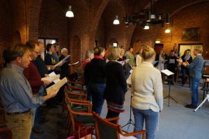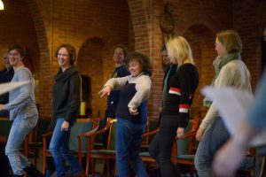 We zijn voor dit weekend neergestreken in de volksabdij van Ossendrecht. Voor het nieuwe prachtige stuk van Ola Gjeilo’s Dark night of the soul, moeten we het ritme nog in ons lijf krijgen. Verwoed klappen we ritmische op onze knieën en dansen we met tussenstapjes van ons linkerbeen op ons rechterbeen (of was het andersom?). Sofia voelt een Spaanse dans, knipt met haar vingers en beweegt sierlijk mee met haar armen. Ola Olé.