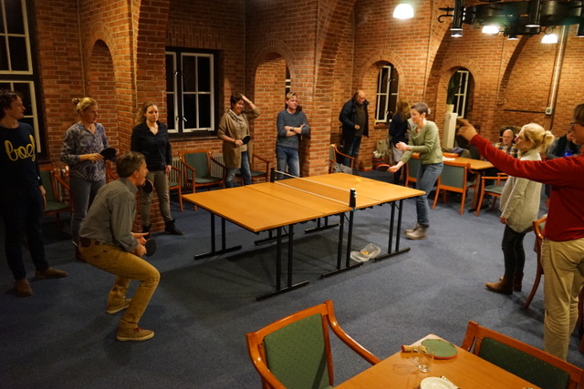 Het heerlijke van een weekend weg met muzikale en leuke mensen is dat iedereen wel iets extra’s kan zingen of spelen. Of juist iets voor anderen doet op het gebied van yoga, mediteren, hardlopen, een advent-ceremonie (Judith!) of gewoon lekkere dingetjes maakt om van te snoepen. Dick speelt in de avond op zijn zelfgemaakte dulcimer, Judith op haar altfluit en Maartje zingt een schitterend Keltisch lied. Maar ook onze traditie in de pauzes ontbreekt niet: de tafeltennisrace, drie tafels tegen elkaar, een netje ertussen en hollen maar met die badjes.