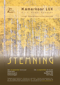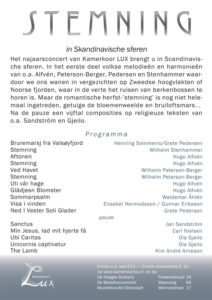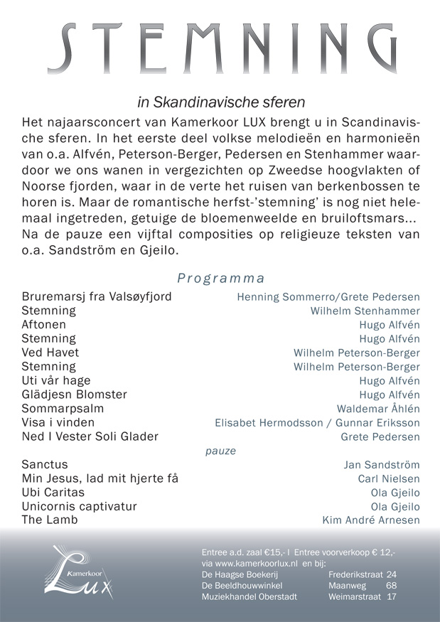 Het najaarsconcert van Kamerkoor LUX brengt je in Scandinavische sferen, met volkse melodieën en harmonieën, waardoor we ons wanen in vergezichten op Zweedse hoogvlakten of Noorse fjorden, met bloemenweelde en bruiloftsmars … en met nog veel meer.